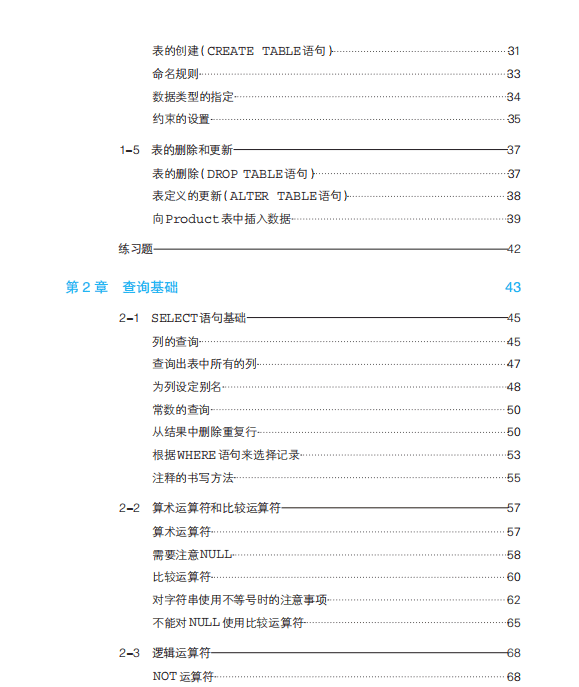 第0章 绪论——搭建SQL的学习环境 1 0-1 PostgreSQL的安装和连接设置 3 安装步骤 3 修改设置文件 7 0-2 通过PostgreSQL执行SQL语句 9 连接PostgreSQL(登录) 9 执行SQL语句 10 创建学习用的数据库 11 连接学习用的数据库(登录) 12 第1章 数据库和SQL 13 1-1 数据库是什么 15 我们身边的数据库 15 为什么DBMS那么重要 16 DBMS的种类 18 1-2 数据库的结构 20 RDBMS的常见系统结构 20 表的结构 22 1-3 SQL概要 25 标准SQL 25 SQL语句及其种类 26 SQL的基本书写规则 27 1-4 表的创建 30 表的内容的创建 30 数据库的创建(CREATE DATABASE语句) 31 表的创建(CREATE TABLE语句) 31 命名规则 33 数据类型的指定 34 约束的设置 35 1-5 表的删除和更新 37 表的删除(DROP TABLE语句) 37 表定义的更新(ALTER TABLE语句) 38 向Product表中插入数据 39 练习题 42 第2章 查询基础 43 2-1 SELECT语句基础 45 列的查询 45 查询出表中所有的列 47 为列设定别名 48 常数的查询 50 从结果中删除重复行 50 根据WHERE语句来选择记录 53 注释的书写方法 55 2-2 算术运算符和比较运算符 57算术运算符 57 需要注意NULL 58 比较运算符 60 对字符串使用不等号时的注意事项 62 不能对NULL使用比较运算符 65 2-3 逻辑运算符 68 NOT运算符 68 AND运算符和OR运算符 70 通过括号强化处理 72 逻辑运算符和真值 74 含有NULL时的真值 76 练习题 78 第3章 聚合与排序 79 3-1 对表进行聚合查询 81 聚合函数 81 计算表中数据的行数 82 计算NULL之外的数据的行数 83 计算合计值 84 计算平均值 86 计算最大值和最小值 87 使用聚合函数删除重复值(关键字DISTINCT) 89 3-2 对表进行分组 91 GROUP BY子句 91 聚合键中包含NULL的情况 93 使用WHERE子句时GROUP BY的执行结果 94 与聚合函数和GROUP BY子句有关的常见错误 96 3-3 为聚合结果指定条件 101 HAVING子句 101 HAVING子句的构成要素 104 相对于HAVING子句,更适合写在WHERE子句中的条件 105 3-4 对查询结果进行排序 108 ORDER BY子句 108 指定升序或降序 110 指定多个排序键 111 NULL的顺序 111 在排序键中使用显示用的别名 112 ORDER BY子句中可以使用的列 114 不要使用列编号 114 练习题 116 第4章 数据更新 117 4-1 数据的插入(INSERT语句的使用方法) 119 什么是INSERT 119 INSERT语句的基本语法 120 列清单的省略 123 插入NULL 123 插入默认值 124 从其他表中复制数据 126 4-2 数据的删除(DELETE语句的使用方法) 129 DROP TABLE语句和DELETE语句 129 DELETE语句的基本语法 129 指定删除对象的DELETE语句(搜索型DELETE) 130 4-3 数据的更新(UPDATE语句的使用方法) 133 UPDATE语句的基本语法 133 指定条件的UPDATE语句(搜索型UPDATE) 134 使用NULL进行更新 135 多列更新 136 4-4 事务 138 什么是事务 138 创建事务 139 ACID特性 144 练习题 145 第5章 复杂查询 147 5-1 视图 149 视图和表 149 创建视图的方法 151 视图的限制① ——定义视图时不能使用ORDER BY子句 154 视图的限制② ——对视图进行更新 155 删除视图 159 5-2 子查询 160 子查询和视图 160 子查询的名称 163 标量子查询 163 标量子查询的书写位置 166 使用标量子查询时的注意事项 167 5-3 关联子查询 168 普通的子查询和关联子查询的区别 168 关联子查询也是用来对集合进行切分的 171 结合条件一定要写在子查询中 172 练习题 173 第6章 函数、谓词、CASE表达式 175 6-1 各种各样的函数 177 函数的种类 177 算术函数 178 字符串函数 182 日期函数 190 转换函数 194 6-2 谓词 198 什么是谓词 198 LIKE谓词——字符串的部分一致查询 198 BETWEEN谓词——范围查询 202 IS NULL、IS NOT NULL——判断是否为NULL 203 IN谓词——OR的简便用法 204 使用子查询作为IN谓词的参数 205 EXIST谓词 210 6-3 CASE表达式 214 什么是CASE表达式 214 CASE表达式的语法 214 CASE表达式的使用方法 215 练习题 221 第7章 集合运算 223 7-1 表的加减法 225 什么是集合运算 225 表的加法——UNION 225 集合运算的注意事项 228 包含重复行的集合运算——ALL选项 229 选取表中公共部分——INTERSECT 230 记录的减法——EXCEPT 231 7-2 联结(以列为单位对表进行联结) 234 什么是联结 234 内联结——INNER JOIN 235 外联结——OUTER JOIN 240 3张以上的表的联结 243 交叉联结——CROSS JOIN 246 联结的特定语法和过时语法 249 练习题 254 第8章 SQL高级处理 255 8-1 窗口函数 257 什么是窗口函数 257 窗口函数的语法 258 语法的基本使用方法——使用RANK函数 258 无需指定PARTITION BY 261 专用窗口函数的种类 262 窗口函数的适用范围 263 作为窗口函数使用的聚合函数 264 计算移动平均 266 两个ORDER BY 269 8-2 GROUPING运算符 271 同时得到合计行 271 ROLLUP——同时得出合计和小计 272 GROUPING函数——让NULL更加容易分辨 277 CUBE——用数据来搭积木 279 GROUPING SETS——取得期望的积木 281 练习题 282 第9章 通过应用程序连接数据库 283 9-1 数据库世界和应用程序世界的连接 285 数据库和应用程序之间的关系 285 驱动——两个世界之间的桥梁 286 驱动的种类 287 9-2 Java基础知识 289 第一个程序Hello,World 289 编译和程序执行 291 常见错误 294 9-3 通过Java连接PostgreSQL 298 执行SQL语句的Java程序 298 Java是如何从数据库中获取数据的呢 299 执行连接数据库的程序 301 选取表中的数据 302 更新表中的数据 305 小结 307 练习题 307 附录 练习题答案 308