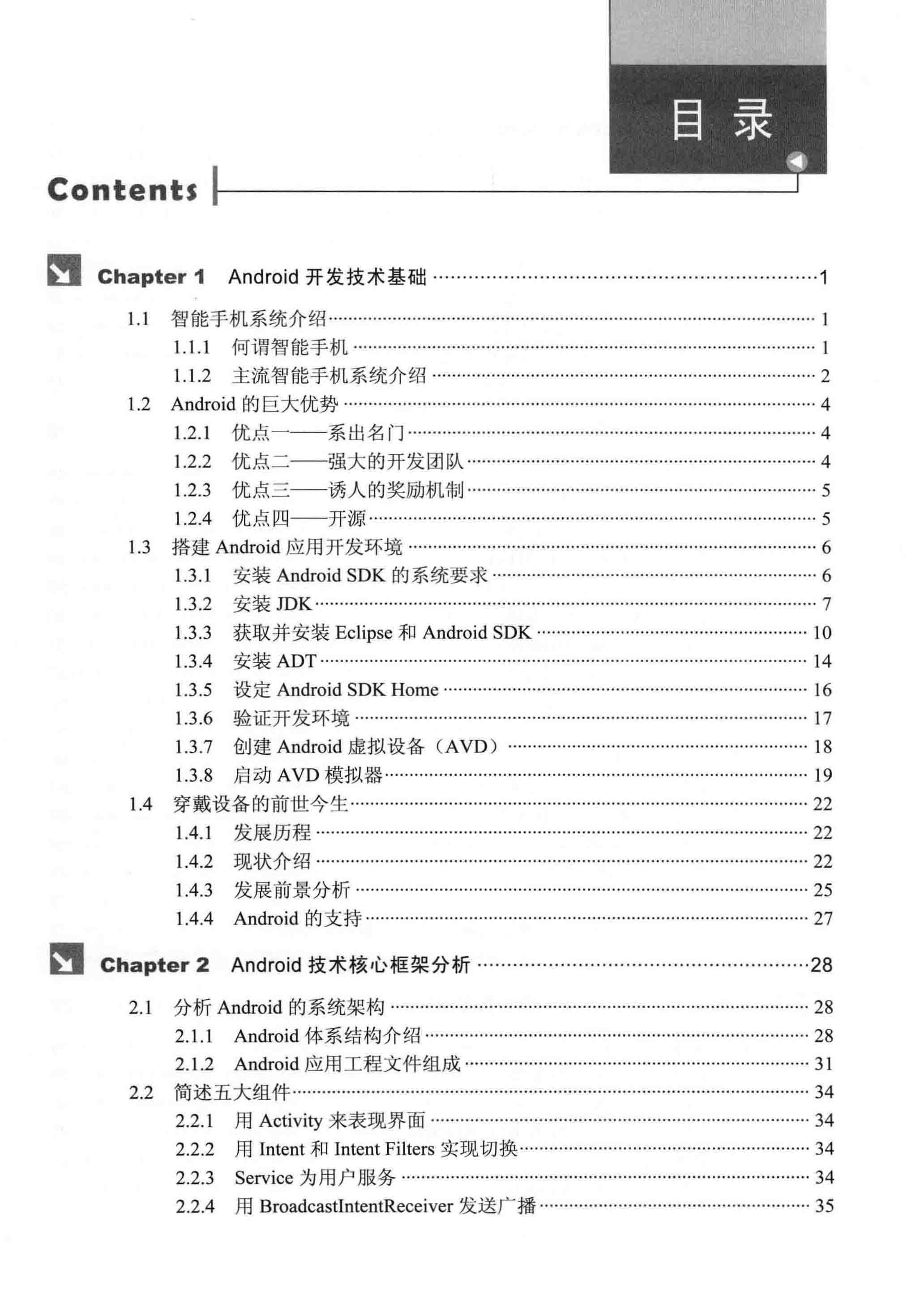 1.1 智能手机系统介绍 1.2 Android的巨大优势 1.3 搭建Android应用开发环境 1.4 穿戴设备的前世今生 Chapter 2 Android技术核心框架分析 2.1 分析Android的系统架构 2.2 简述五大组件 2.3 进程和线程 2.4 分析Android源码结构 2.5 Android和Linux的关系 2.6 第一段Android程序 Chapter 3 HTTP数据通信 3.1 HTTP基础 3.2 使用Apache接口 3.3 使用标准的Java接口 3.4 使用Android网络接口 3.5 实战演练 Chapter 4 使用Socket实现数据通信 4.1 Socket编程初步 4.2 TCP编程详解 4.3 UDP编程 4.4 实战演练——在Android中使用Socket实现数据传输 Chapter 5 下载远程数据 5.1 下载网络中的图片数据 5.2 下载网络中的JSON数据 5.3 下载某个网页的源码 5.4 远程获取多媒体文件 5.5 多线程下载 5.6 远程下载并安装APK文件 Chapter 6 上传数据 6.1 Android上传数据技术 6.2 实战演练——上传文件到远程服务器 6.3 使用GET方式上传数据 6.4 使用POST方式上传数据 6.5 使用HTTP协议实现上传 Chapter 7 传感器技术 7.1 Android传感器系统概述 7.2 使用SensorSimulator 7.3 使用传感器 Chapter 8 人工智能技术 8.1 人工智能基础 8.2 图搜索在人工智能中的应用 8.3 实战演练——各种AI图搜索算法在Android游戏中的用法 Chapter 9 语音识别和手势识别 9.1 语音识别技术 9.2 手势识别 Chapter 10 蓝牙技术基础 10.1 蓝牙概述 10.2 低功耗蓝牙基础 10.3 蓝牙规范 10.4 低功耗蓝牙协议栈详解 10.5 TI公司的低功耗蓝牙 Chapter 11 Android蓝牙模块详解 11.1 Android系统中的蓝牙模块 11.2 分析蓝牙模块的源码 11.3 和蓝牙相关的类 11.4 在Android平台开发蓝牙应用程序 11.5 在穿戴设备中开发一个蓝牙控制器 Chapter 12 蓝牙4.0 BLE详解 12.1 短距离无线通信技术概览 12.2 蓝牙4.0 BLE基础 12.3 低功耗蓝牙协议栈详解 Chapter 13 项目实战——开发智能心率计 13.1 什么是心率 13.2 什么是心率表 13.3 开发一个Android版测试心率系统 Chapter 14 项目实战——开发计步器 14.1 系统功能模块介绍 14.2 系统主界面使用说明