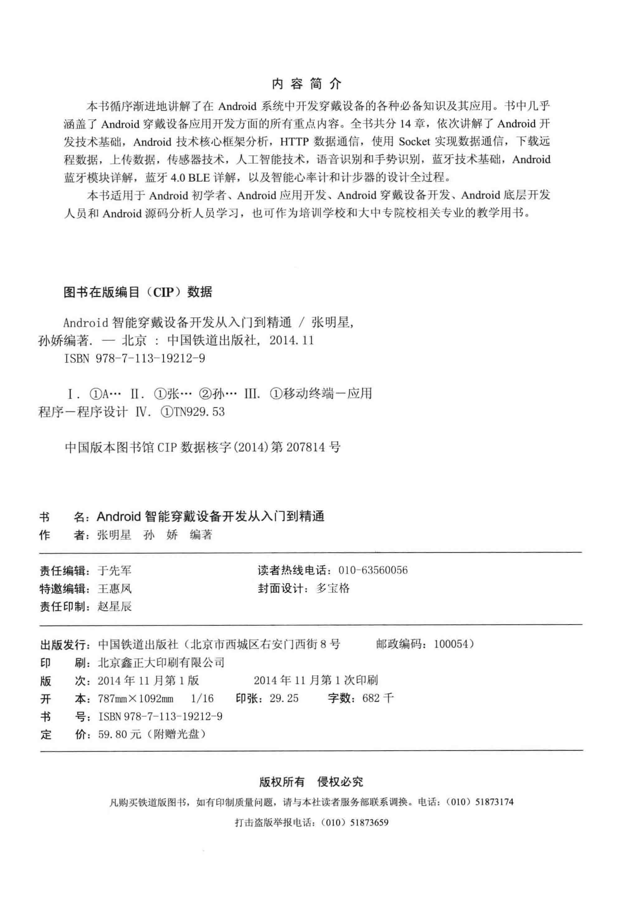 android智能穿戴设备开发从入门到精通是一本安卓智能化穿戴设备设计手册,由张明星和孙娇两人共同编著。本书详细讲解了Android开发技术基础,Android技术核心框架分析,HTTP数据通信,使用Socket实现数据通信,下载远程数据,上传数据,传感器技术,人工智能技术,语音识别和手势识别,蓝牙系统应用,智能心率计设计,计步器设计等知识。内容几乎涵盖了Android穿戴设备应用开发方面的所有主要技术,并且全书内容言简意赅,讲解方法通俗易懂,不但适合应用高手的学习,也特别适用于初学者学习。