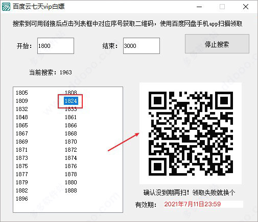 选择链接,如:1824,右侧会出现一个二维码,打开手机端的百度云扫描二维码领取便可;
