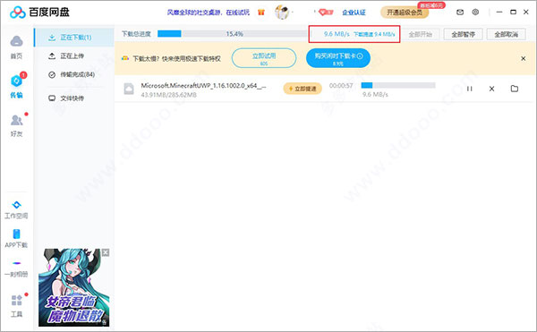 以下载为例子,可以看到下载速度是9.6MB/s,速度还是很不错的,你也快来下载试试吧!