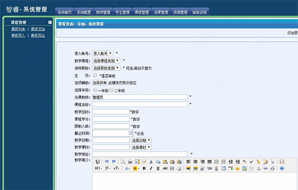5、课程添加界面,录入帐号、教学课程、讲师职称、生效、选项辅助、选择年级、任课教师、课程名称、教学总时