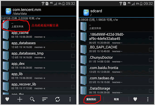 7、然后点击三次顶部的“..”返回到根目录,再点击进入sdcard文件夹,并点击底部的“复制到此”按钮,如下图所示: