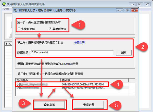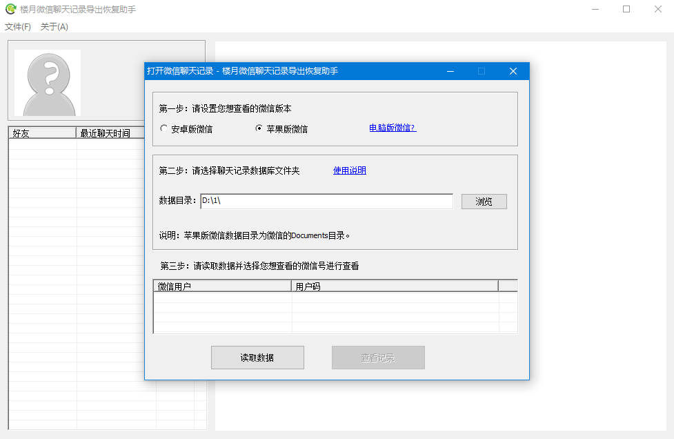 3、选择微信版本,然后设置好相应目录,点击“读取数据”按钮,然后软件会将目标文件夹中的微信号读取出来,点击想查看的微信号后再点击查看按钮即可;