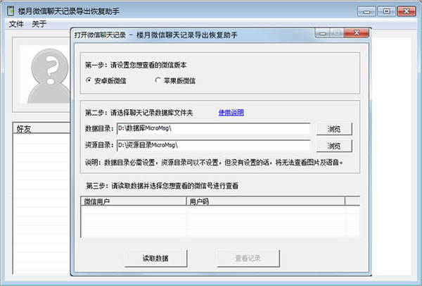 9、微信版本设置为“安卓版微信”,数据目录及资源目录设置为之前导出的两个MicroMsg文件夹(两个文件夹的顺序不能错),然后点击“读取数据”按钮,再单击选择一个微信用户后点击“查看记录”按钮;