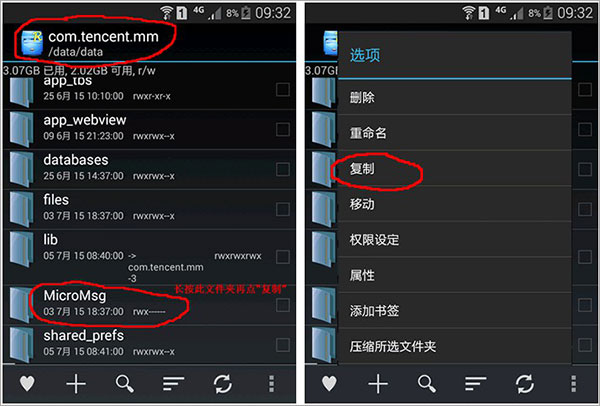 6、在手机上打开刚安装的“RE管理器 rootexplorer”软件,然后依次点击进入data\data\com.tencent.mm\,用手指一直按住“MicroMsg”文件夹,再点击弹出菜单中的“复制”,如下图所示: