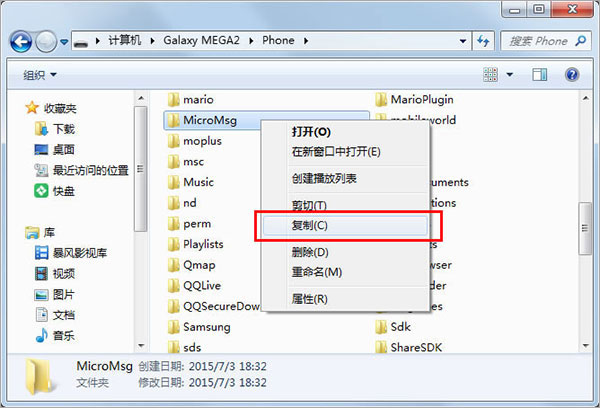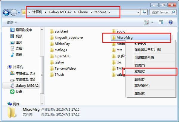 4、以安卓手机为例,将手机与电脑进行连接,然后打开手机盘符下的Tencent文件夹,将该MicroMsg文件夹复制到电脑上的某个文件夹中,并将复制到电脑上的MicroMsg文件夹重命名为“资源目录MicroMsg”;