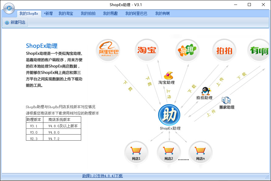可以将ShopEx助理绑定一个淘宝、易趣、阿里巴巴、拍拍用户ID,这样就可以从这些平台下载商品到助理,而后导入本地商店或者网上商店。