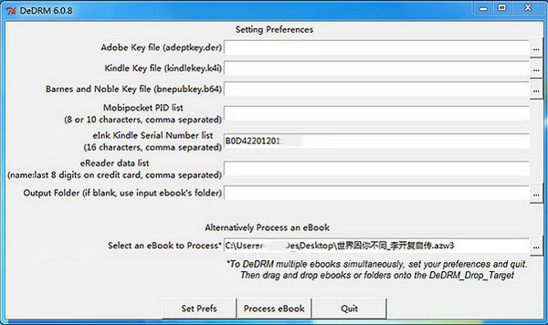 在【eInk Kindle Serial Number list】一栏中填写你的 Kindle 序列号,然后点击下方的【Set Prefs】按钮保存。接下来,点击界面下面的【Select an eBook to Process】一栏后面的【…】按钮,选择电子书,点击【Process eBook】即可完成破解。