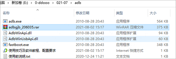 4、ADB工具包无需安装,官方版的压缩包包含可执行文件adb.exe,动态链接库文件AdbWinApi.dll和AdbWinUsbApi.dll,解压后可直接通过命令窗口调用。