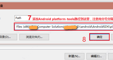 4、然后点击环境变量——编辑Path,将步骤1 adb所在路径添加到Path变量值中。最后点击“确定”。