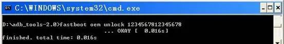 在PC机命令行窗口中输入fastboot oem unlock*,*号为16位解锁密码,例如:fastboot oem unlock 1234567812345678。