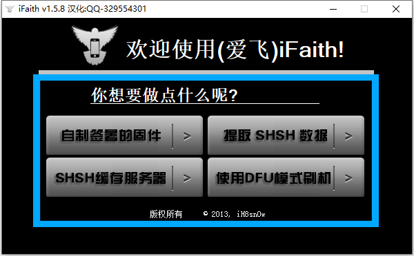 ifaith汉化版是网友基于官方开发的ifaith新版本而制作的一款苹果设备备份shsh的实用工具,拥有自制签署的固件,提取shsh数据,shsh缓存服务器,使用dfu模式刷机四大功能,可以帮助用户更好的备份shsh信息,同时也可以将手机刷机升级后再次进行降级操作。