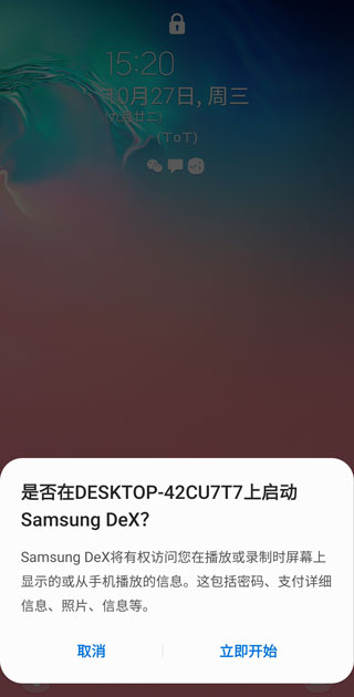 5、识别成功后,手机上会提示是否在电脑上启动Samsung Dex,点击立即开始;