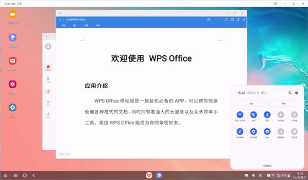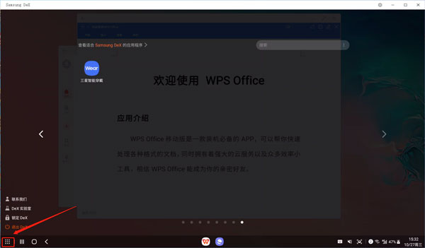 Samsung Dex是由三星推出的一款多屏协同软件,用Samsung DeX来挑战您的Galaxy,您的设备比预想的强大,给您的朋友发短信,在大屏幕上看电影,为您的大型演示做好准备,所有这些都可借助Samsung DeX利用Galaxy设备完成,强大的多任务工具现在可无线连接。你可以在大屏幕上直接使用手机上的文件和各种软件,而且可以强制软件放大,保证你在大屏幕上的体验更好,并且还有各种办公软件,比如wps,直接使用键盘鼠标操作,大屏幕直接编辑,所有内容都存放在手机上,只需要带着手机就可以保存所有资料。同样,你也可以通过此功能投屏到屏幕上看电影,然后通过手机来控制屏幕上的播放进度等一系列操作。感兴趣的朋友快来下载体验吧。