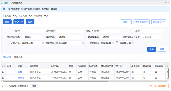 (1)人员信息采集:根据《个人所得税基础信息表(A表)》的要求采集相关信息,系统采用先报送人员信息再填写报表的方式。