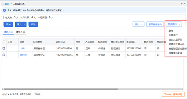 更多操作包括删除、批量修改、自定义显示列、隐藏非正常人员、身份验证状态更新、特殊情形处理功能。