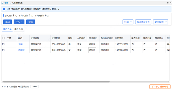 3、人员信息采集主要包括【添加】、【导入】、【报送】、【导出】、【展开查询条件】和【更多操作】功能。