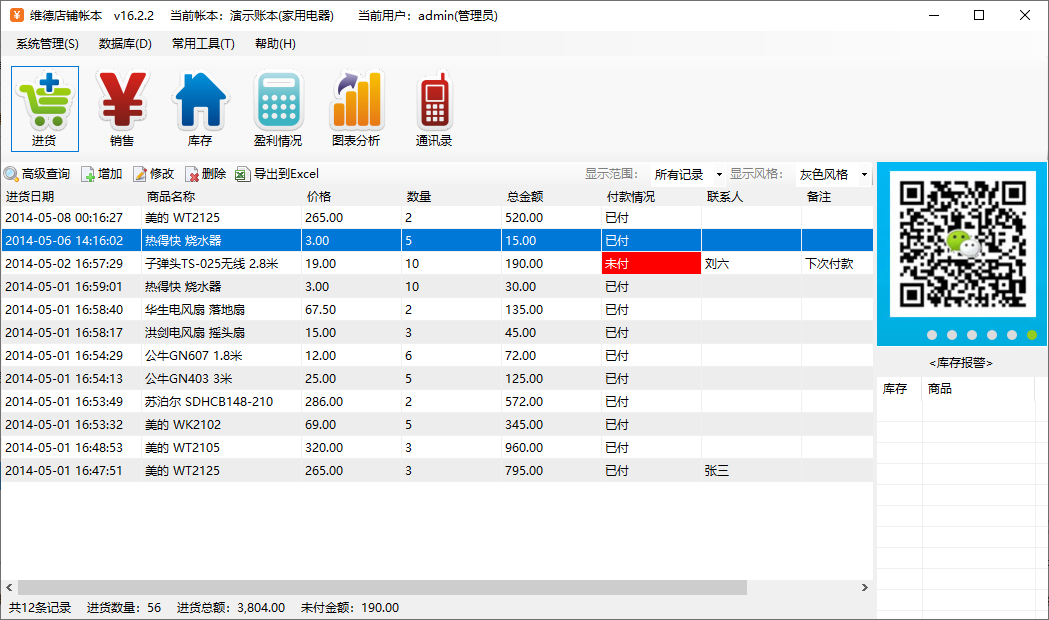 中小型店铺想要发展的更好肯定是离不开一款好用的管理软件的,在这里小编向您推荐这款维德店铺帐本官方版,这是一款绿色免费的店铺管理记帐软件,可以有效的帮助你完成账务的录入、查询和统计,你只需要轻轻的按动一下鼠标即可,同时还拥有账务的录入、盈利分析、库存查询、图表分析、通讯录等多种实用的功能,有了这款维德店铺帐本软件以后,相信你的店铺会越来越好的!
