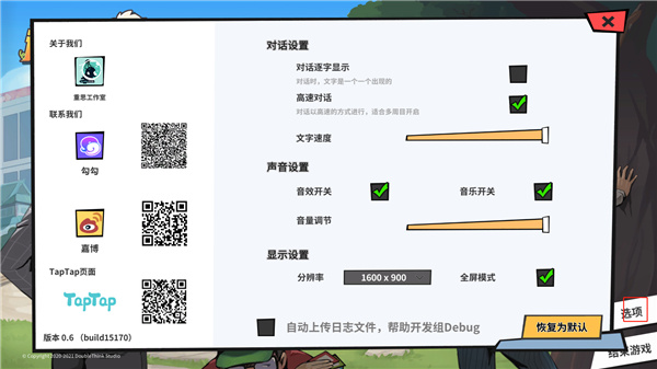 3、点击选项,玩家可自定义设置对话、声音、分辨率等等设置