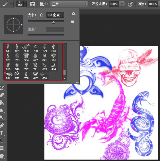 4、找到最后的画笔就是ps纹身素材笔刷,有多种类别,用户可以调整大小直接放在图片上使用。