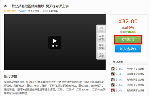 4、注册成功后,搜索到您想要学习的课程后,点击课程图片或者课程名,就会打开课程信息页。如果您觉得这是您需要的课程,点击"立即购买";