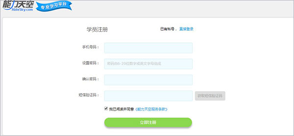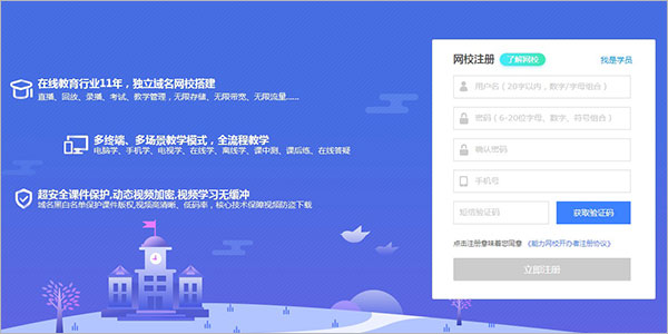 学员注册:需要输入手机号、短信验证码即可完成注册;