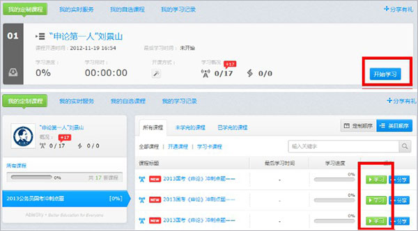 8、进入个人中心后,学员可以在“我的定制课程(培训机构老师给学员开通的课程)”或者“我的自选课程(学员通过网银、支付宝或者学习卡购买的课程)”来学习视频。点击“开始学习”;