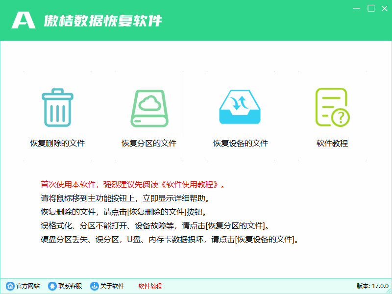 傲桔数据恢复软件是一款非常好用的免费数据恢复软件,也叫全能数据恢复大师。该软件支持支持微软操作系统用到的NTFS分区、FAT和FAT32分区、exFAT分区的数据恢复,能够恢复经过回收站删除掉的文件、被Shift+Delete键直接删除的文件和目录,快速格式化过的分区、完全格式化的分区、分区表损坏和盘符无法正常打开的分区数据、在磁盘管理中删除的分区、被重新分区过的硬盘数据、被第三方软件做分区转换时丢失的文件等,功能非常的强大,是你找回丢失文件最好的帮手。