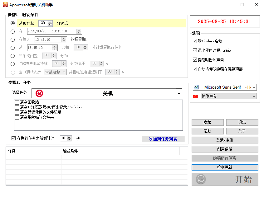 apowersoft定时关机助手官方版是一款非常好用的定时关机工具。该软件功能十分丰富,而且操作简单,非常容易上手。它不仅能够帮助您轻松设置电脑定时关机,甚至你可以将时间设定在具体的一天,非常精准,而且此款软件可以随机启动,在后台运行,并且按您设定的时间自动关闭电脑。在设定的过程中,你还可以进行附带的添加任务,比如清空回收站、清除浏览记录等,十分方便。除了定时关机的功能之外,此款软件还能够满足您定时注销、重启、锁定、休眠电脑等需求。只需两步,您便可轻松设定任务。有需要的朋友快来下载体验吧!!!