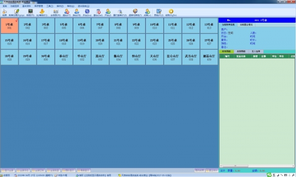 包括开台、点单、预定、账单更改、退单、换台、结账、挂账、叫回账单;预定单打印、自主设定单品打折时商品单价是四舍五入精确到元、角还是分;结账方式可供选择,支持对一个账单采取多种方式结账等。对营业场所进行的销售业务的管理。提供两种前台经营模式:中餐模式和POS收银模式,POS收银模式可以适合于先交钱后消费的场所,两种模式的选择是通过前台程序进行设置。
