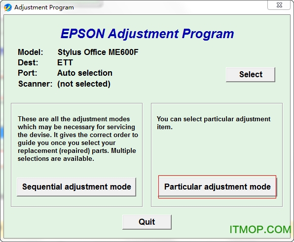 3、再选择:Perticular adjustment mode,后选择:Waste ink pad counter。