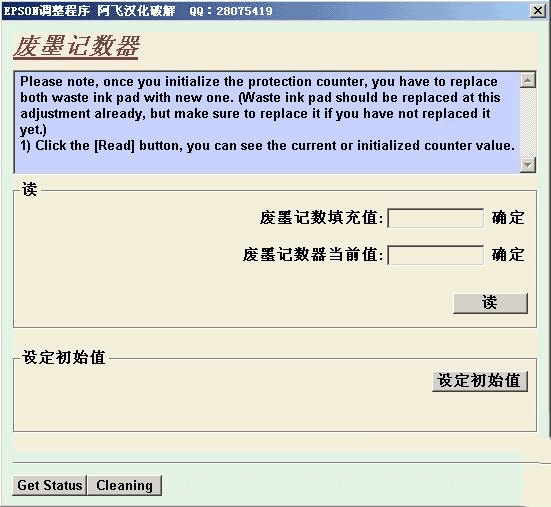 3、点下“读”,就可以读出废墨计数器的当前值,点下下面的“设定初始值”就可以恢复到出厂设置了。