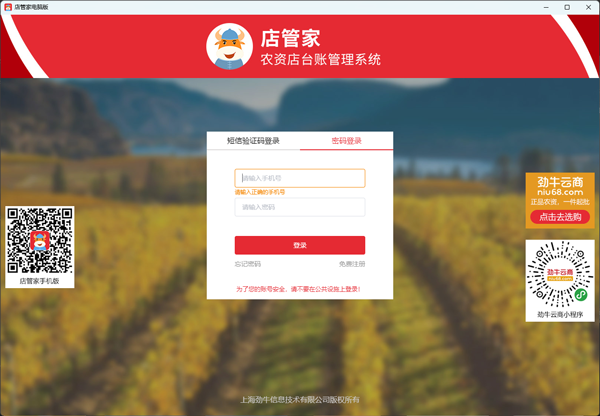 劲牛店管家农资店进销存台账管理软件是由劲牛公司出品的专门针对农资店开发的电脑版进销存管理软件,旨在帮助农资店实现高效的库存管理和业务运营。该软件以简洁易用、功能强大为特点,能够全面满足农资店在进货、销售、库存管理等方面的需求。农资赊账是常态,欠款提醒面子抹不开?店管家一键催款,轻点两下,欠款信息送达用户全部客户,从此要账不再愁,操作简单便捷,让您真正地摆脱用本子记账的老黄历,再也不用担心账本丢失带来的潜在风险等问题,同时清晰明了的经营数据报表,让您彻底告别糊涂账。