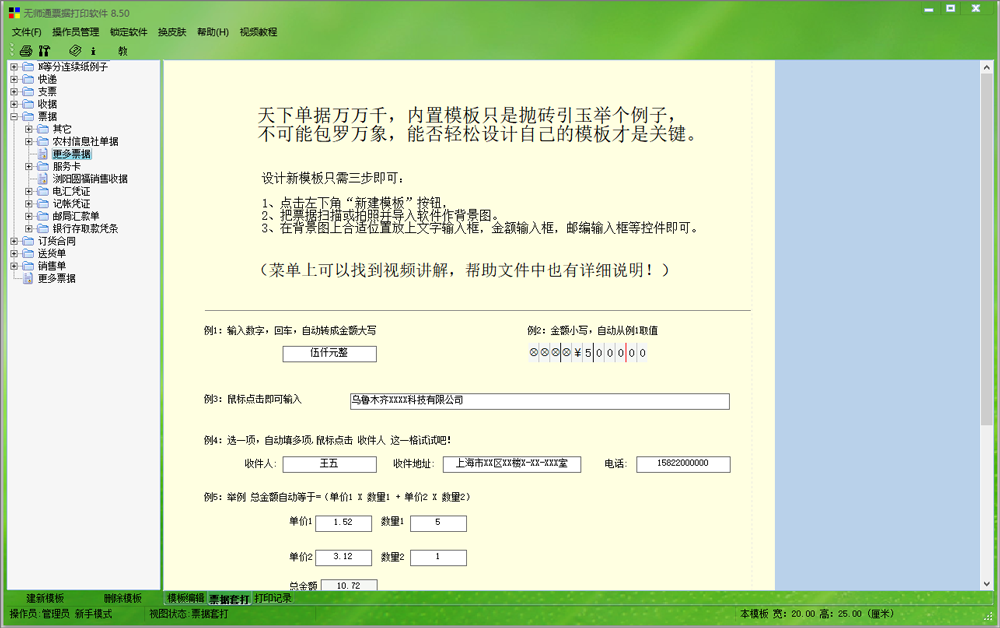 4、可以自己设计任何的票据模板,并进行打印、套打并记录
