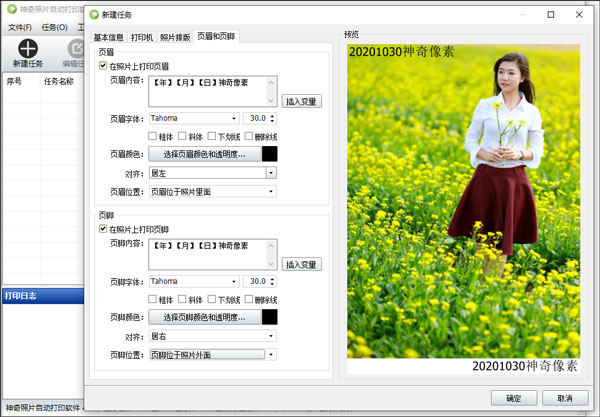 4、页眉页脚可以自定义插入变量,设置字体的大小颜色等,并可以选择页眉页脚的位置是否在照片里如下图所示: