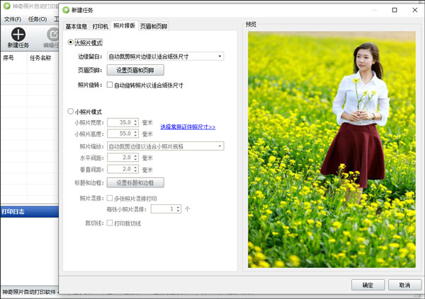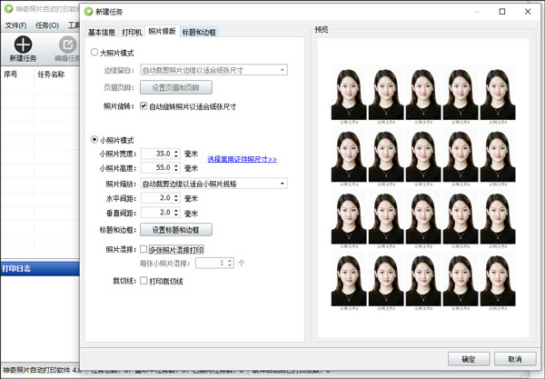 5、选择“小照片模式”,可以自定义照片的宽度和高度,自动裁剪,设定水平和垂直的间距,混排照片可以定义每张小照片混排的个数,如下图所示:
