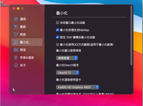自带三种窗口最小化效果99%模拟mac窗口动画,可在dock偏好设置-最小化中勾选开启,最小化动画采用D3D硬件加速渲染,win8以上系统可以使用完整DX11效果。