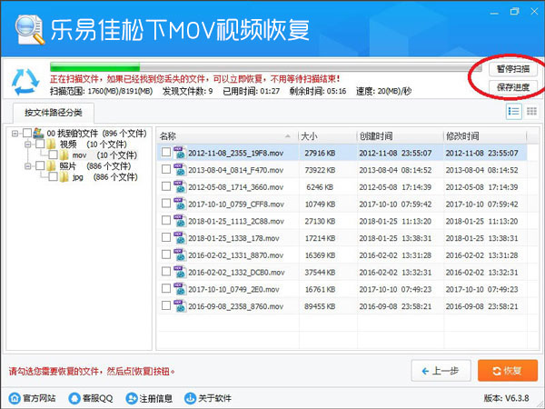 中途你也可以随时点击右上角的“暂停扫描”按钮,暂停扫描,亦或者点击“保存进度”按钮,保存当前扫描到的数据,方便下次继续扫描。