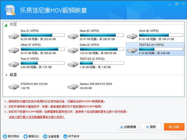 1、运行软件,会看到诸多分区和磁盘,双击需要恢复视频的分区,如TEST-8G(H:NTFS)分区: