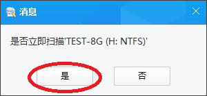 2、当弹出对话框,提示用户是否立即扫描TEST-8G(H:NTFS),这是点是即可直接进行扫描: