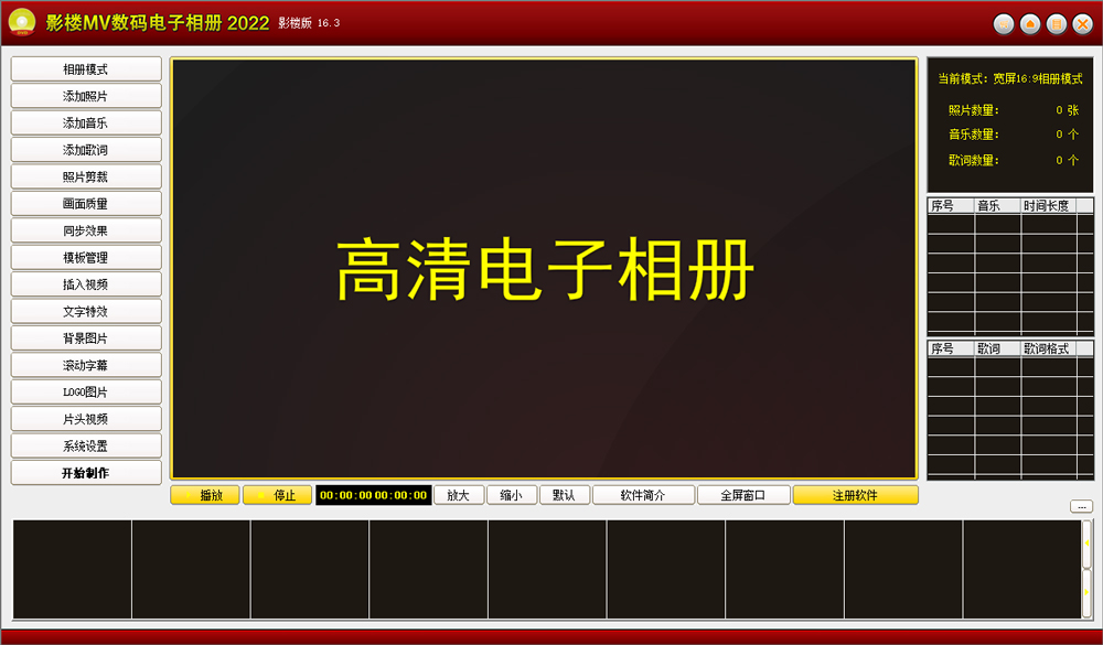 软件采用16:9尺寸,适应宽屏电视的全屏效果。有多种相册尺寸大小可供用户选择,不同的相册格式有不同的相册尺寸大小,例如DVD相册:320×176尺寸,464×256尺寸,640×368尺寸,800×480尺寸,1280×720尺寸,1440×816尺寸,1600×896尺寸,1920×1088尺寸,2048×1152尺寸等等。
