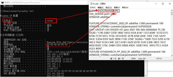 11、运行cmd,输入ipconfig /all,编辑lic.dat并更改HOSTNAME和MAC;