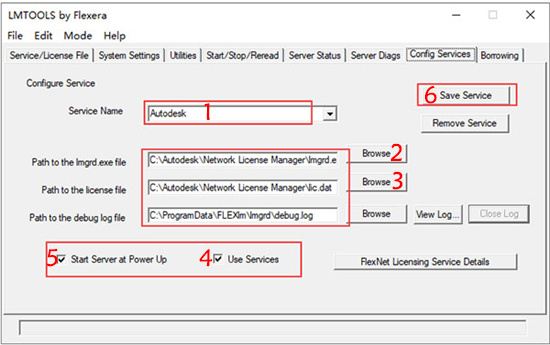 12、在config services中,添加“ Autodesk”服务名称,选择lmgrd.exe作为lmgrd的路径, lic.dat作为许可证文件的路径,然后勾选下面的start server at power up和use services;