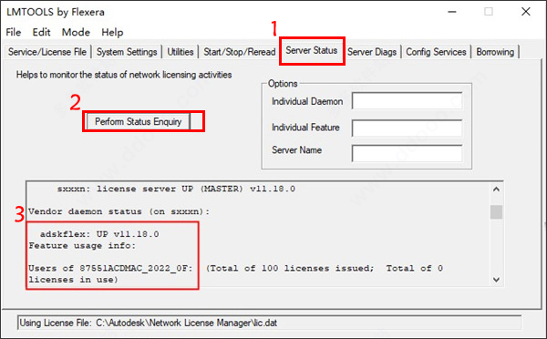 15、最后在“server status”点击“perform status enquiry”,看到有adskflex: UP v11.18.0就表示破解成功了,没有则找到问题重试;