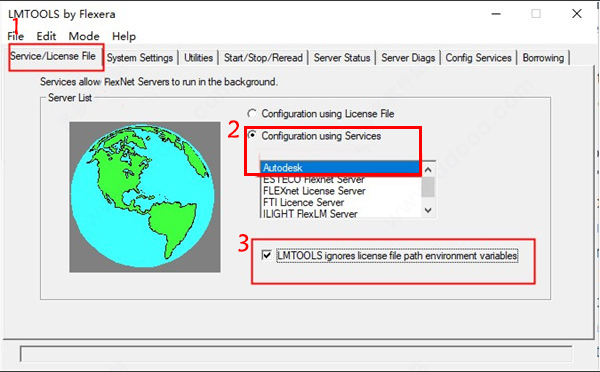 13、在“service/license file”中选择刚才的 Autodesk服务,然后勾选下面的ignore license file path env var;