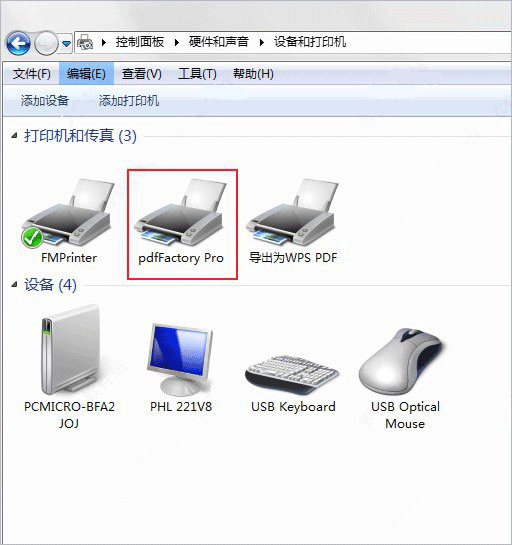 5、进入控制面板-硬件和声音-设备打印机中,可以看到"pdfFactory Pro" 打印机;