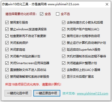 亦美win10优化工具是由亦是美网络最新推出的一款方便实用,功能丰富的Windows系统优化增强工具。它能够支持win10、win8.1、win8系统,可用于禁用一些不常用但又占用系统资源的项目,通过优化从而大幅提升系统运行效率,节省系统资源。