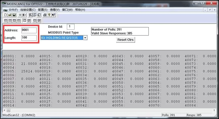 输入要获取数据在寄存器中的开始地址及数据长度。