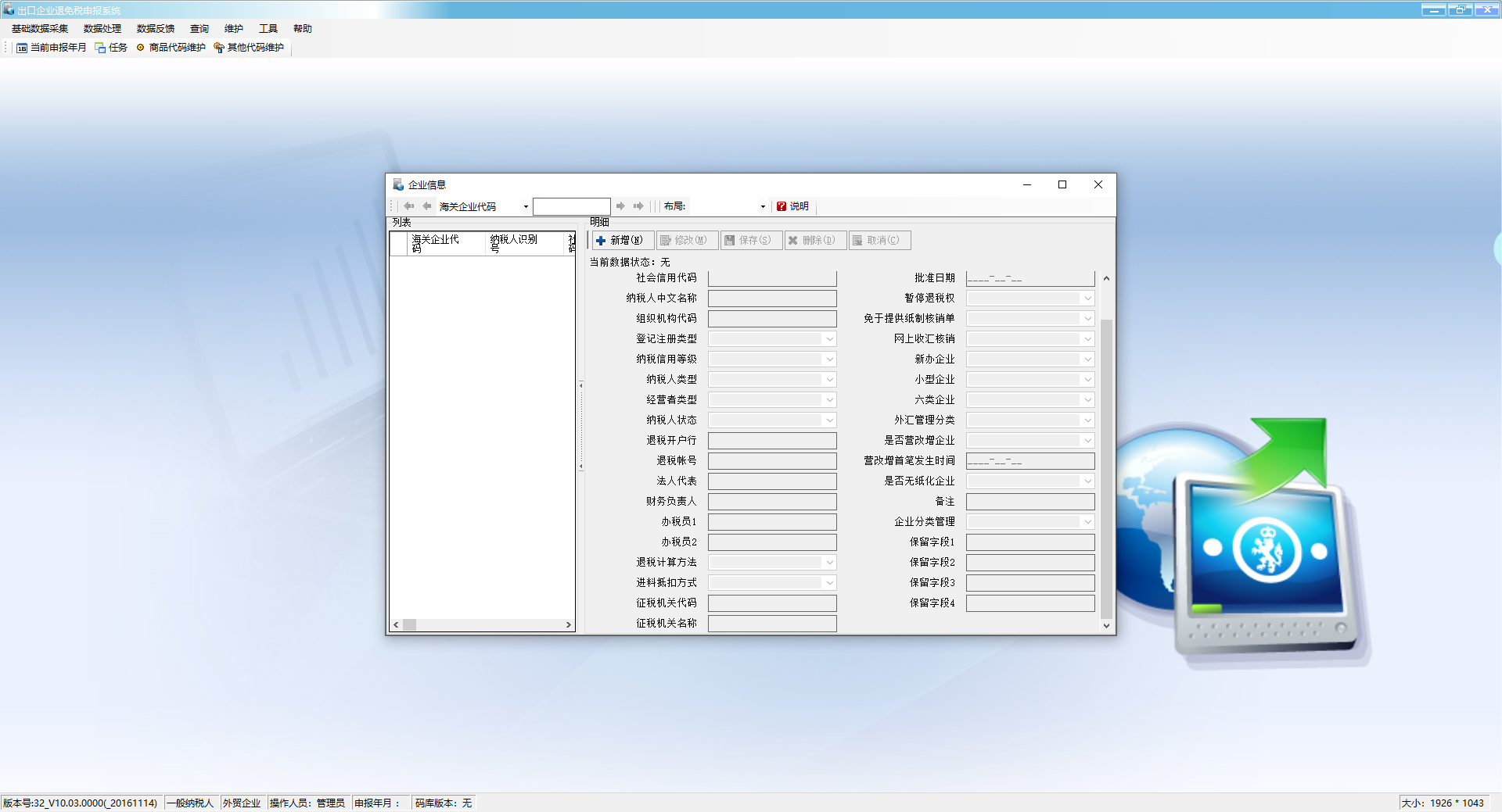 申报年月:6位数字,即:4位年份+2位月份;如“200812”。根据企业进入出口退税软件时填入的申报年月自动带入,可以在“维护——当前申报年月”中进行修改。